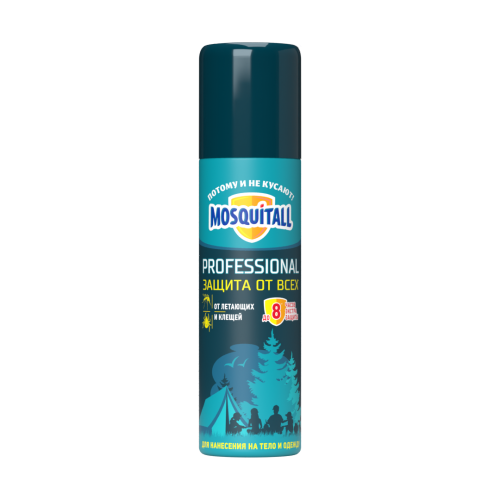 Аэрозоль от всех летающих и ползающих насекомых, репеллентное Mosquitall (Москитол) "Профессиональная защита" предназначено для защиты взрослых людей от кровососущих насекомых: комаров, мокрецов, москитов, мошек, слепней, блох - при нанесении на открытые части тела, от таежный и лесных клещей - при нанесении на одежду и изделия из ткани.