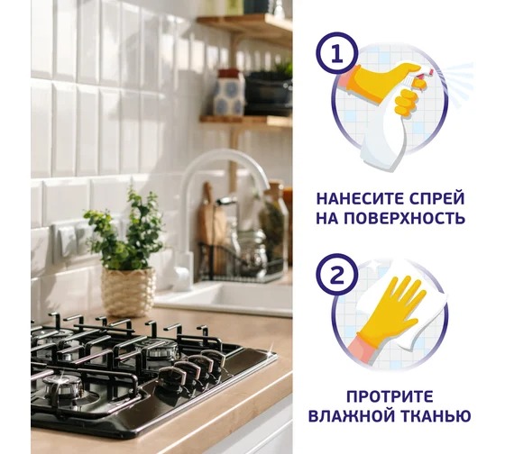 Распылите спрей на влажную тряпку или на саму поверхность.