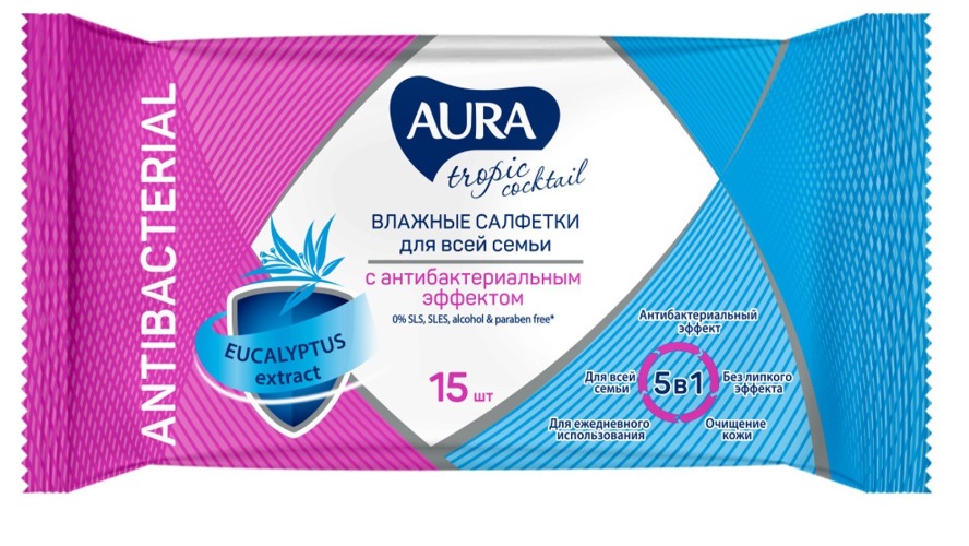 Aura влажные салфетки с антибактериальным эффектомТропический коктейль 15шт