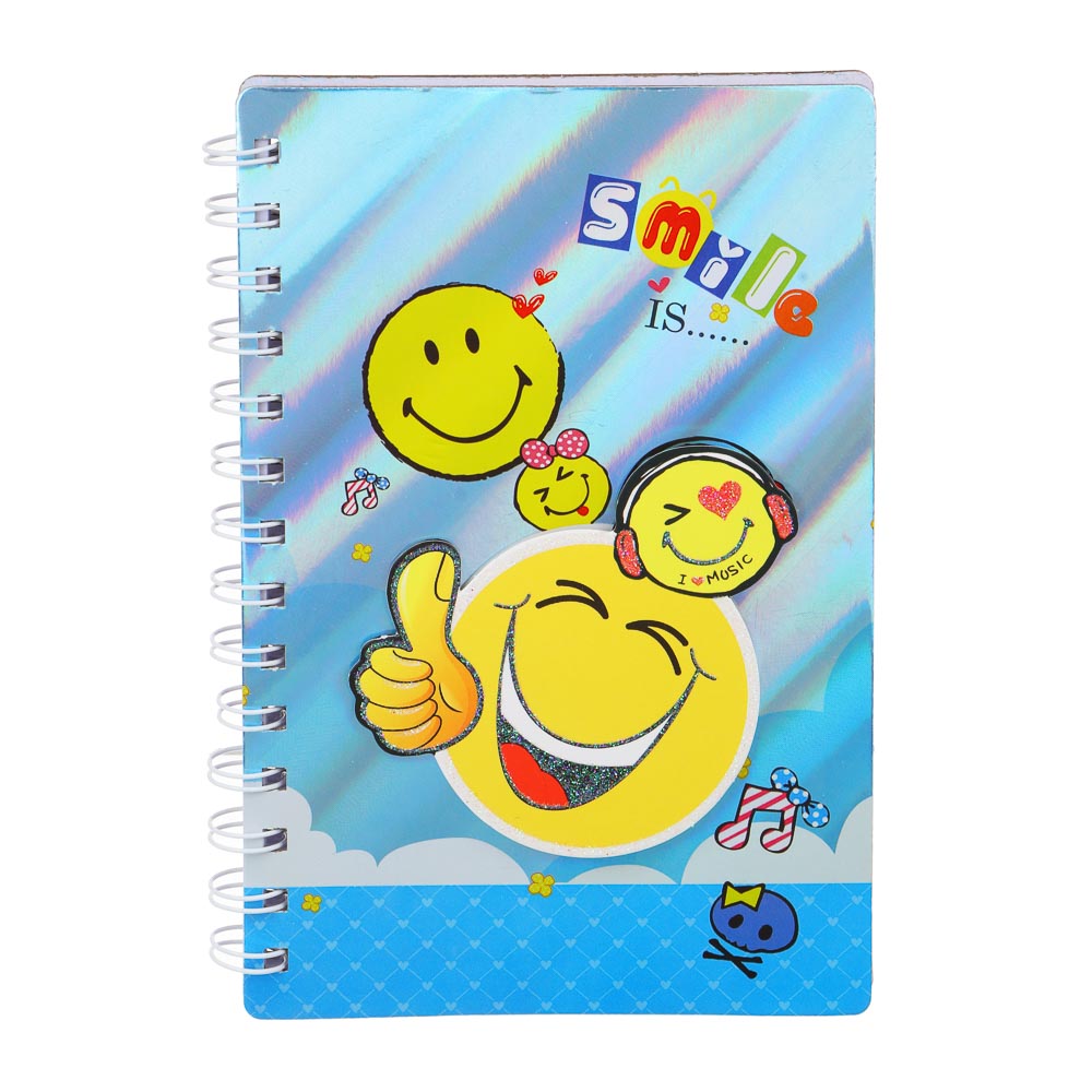 Блокнот имеет забавный дизайн с аппликацией в виде смайликов, которые заражают улыбкой.