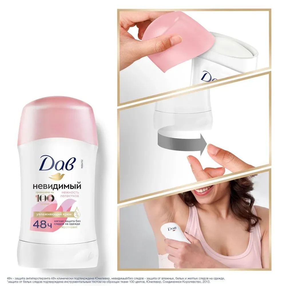 Антиперспирант-карандаш Dove (Дав) "Невидимый. Нежность лепестков" эффективно защищает от пота и запаха на 48 часов.