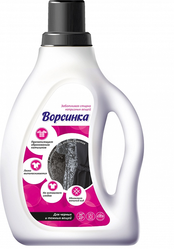 Гель для стирки "Ворсинка" надолго сохранит интенсивность цвета и обновит внешний вид черных и темных вещей.