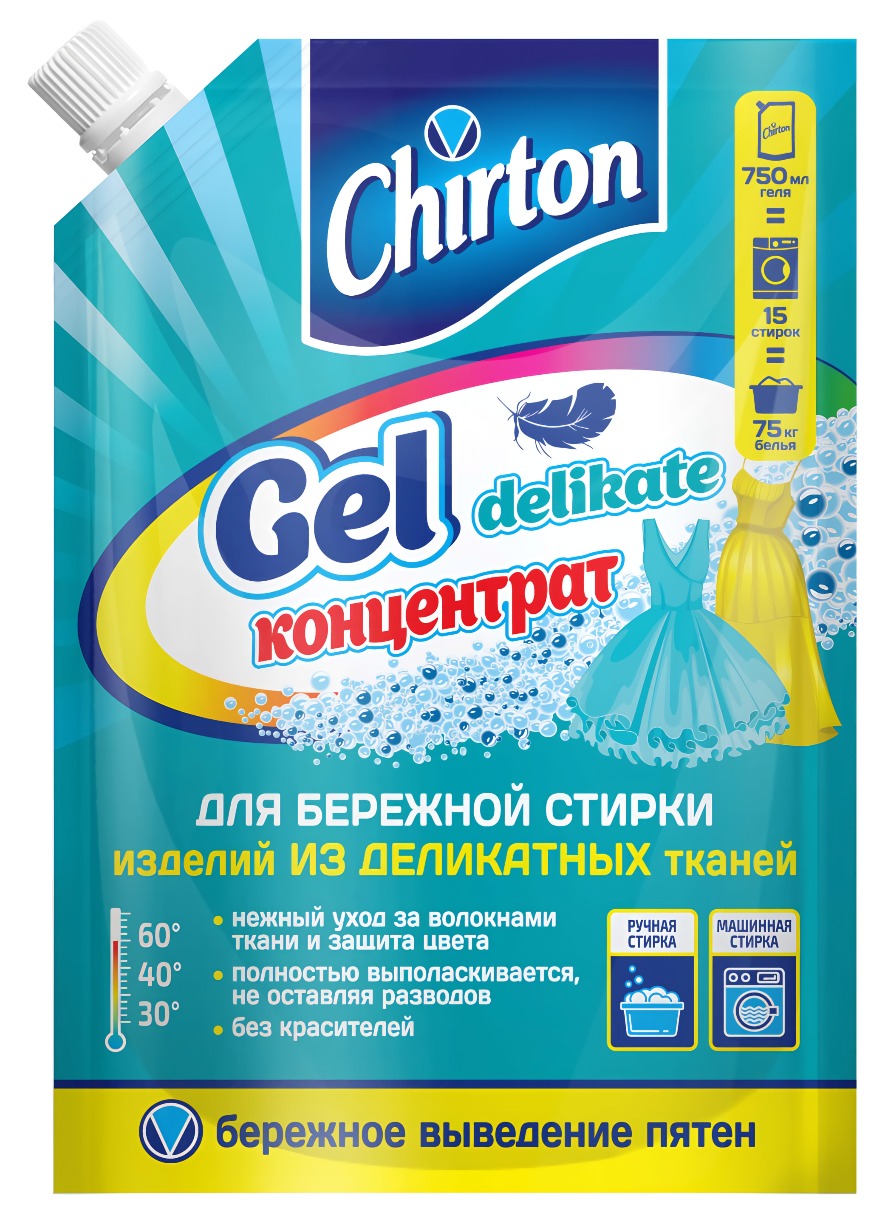 Гель для стирки Чиртон «Для изделий из деликатных тканей» предназначен для стирки вещей и других изделий из деликатных тканей, таких как шерсть, шёлк, кашемир, шифон, кружева, трикотаж и т.д.