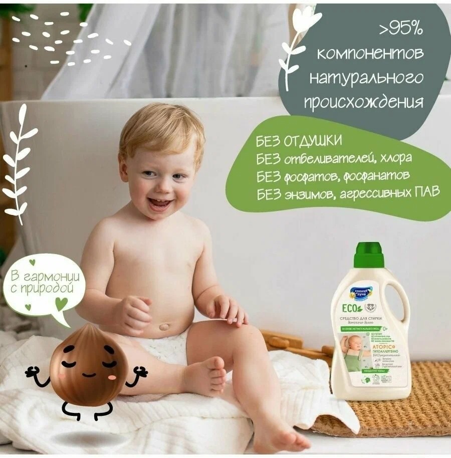 Гипоаллергенное средство Солнце и Луна ECO (Эко) предназначено для стирки детского белья: одежды, пеленок, полотенец, постельного белья.