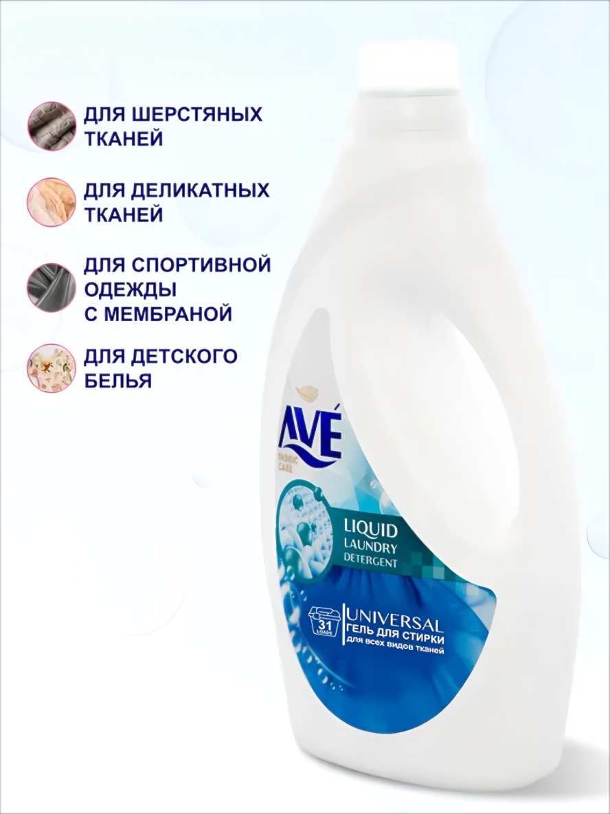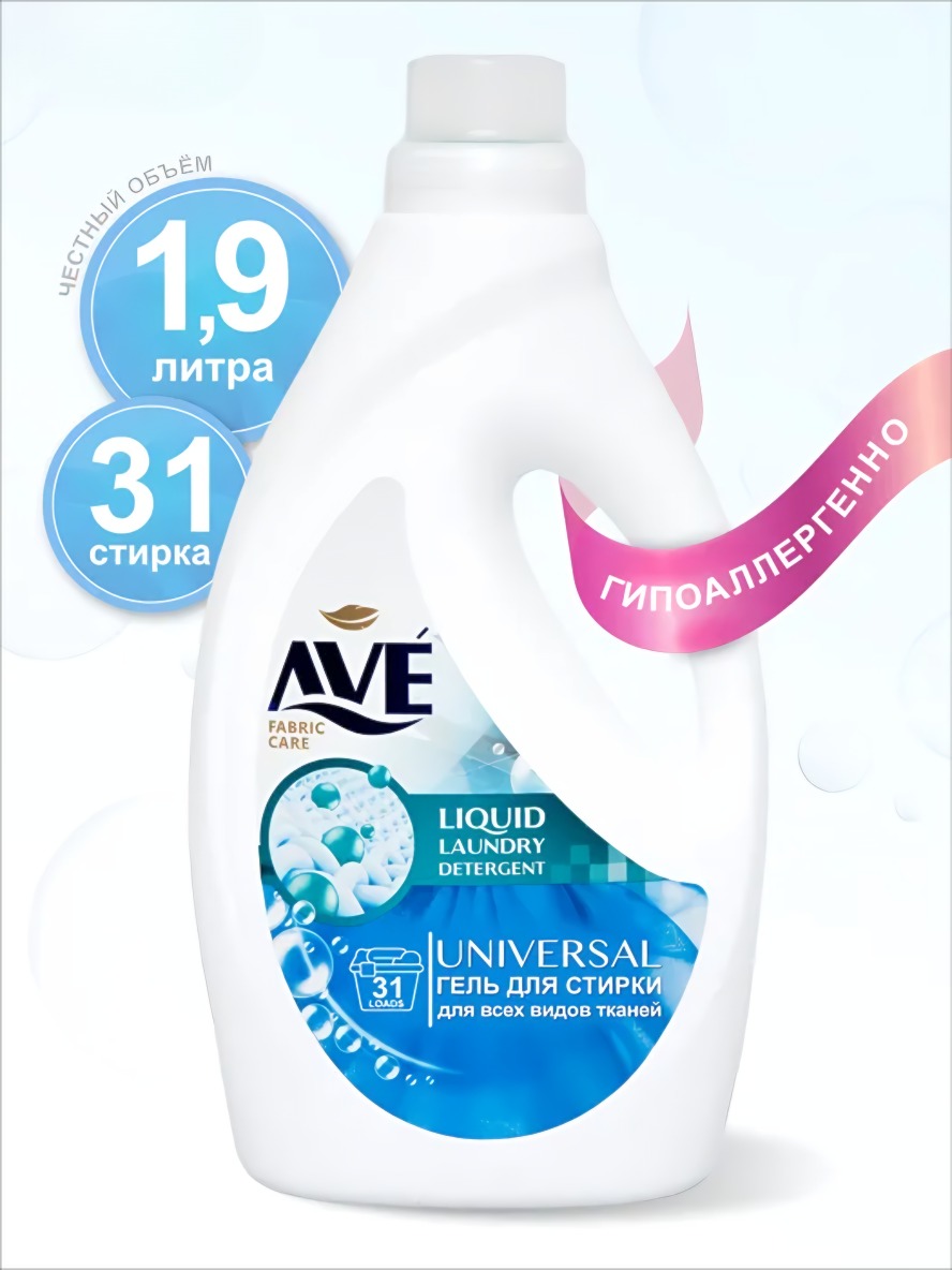 Жидкое универсальное средство для стирки белья AVE (Авэ) одинаково хорошо подходит как для ручной стирки так и для стирки в стиральных машинах любого типа.