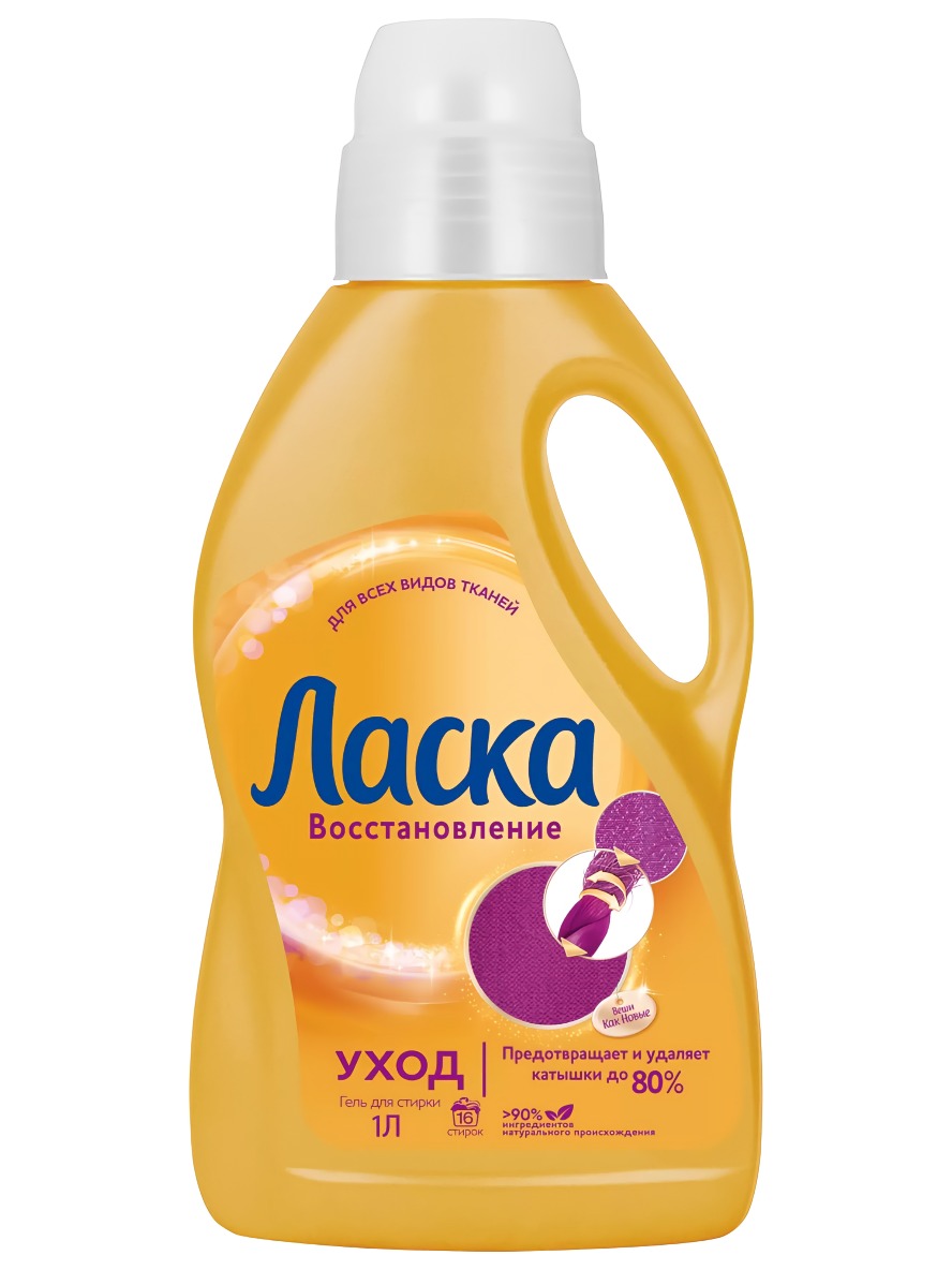 Гель Ласка "Уход и Восстановление" предназначен для стирки тканей, склонных к образованию катышков.