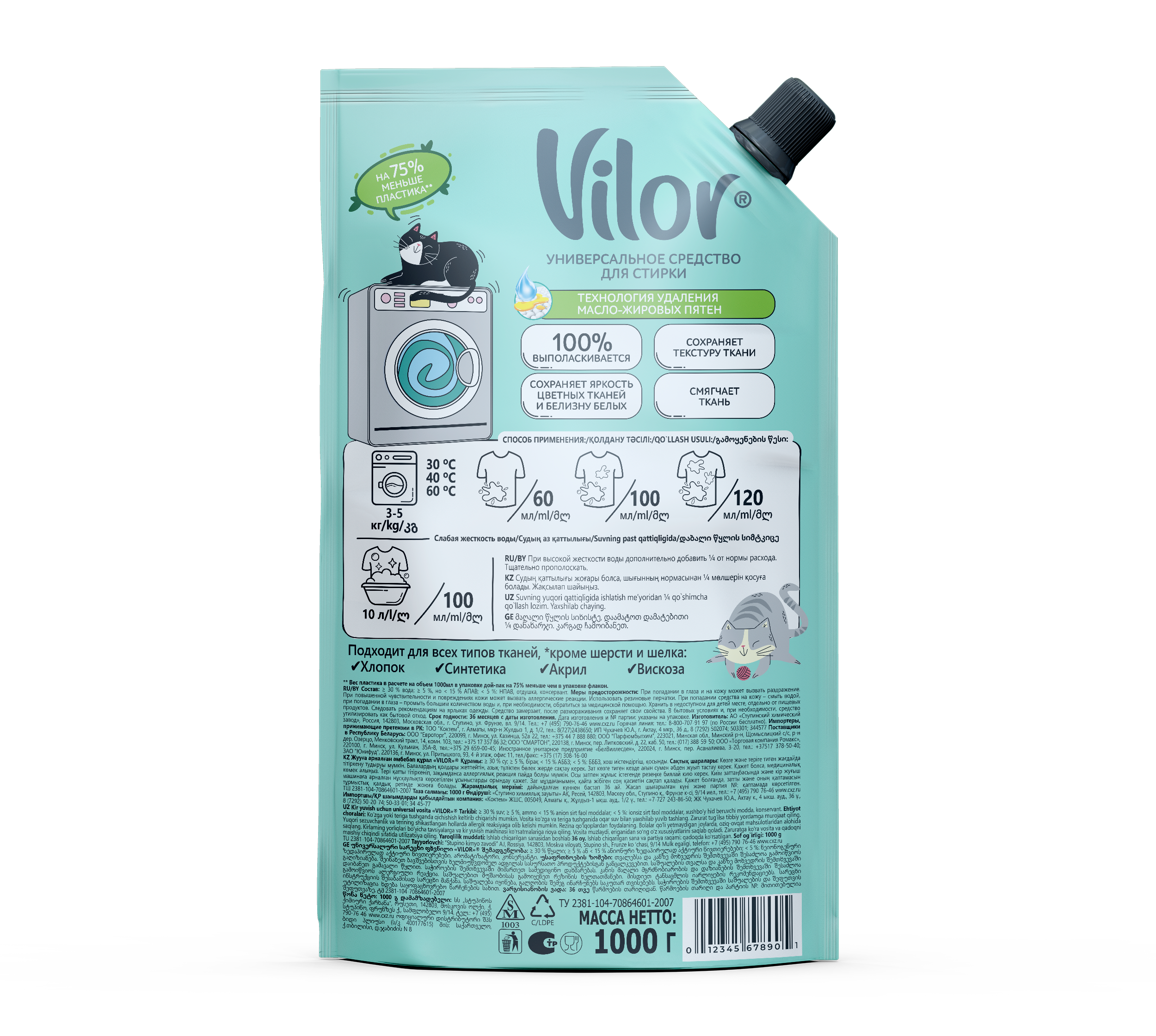 Универсальное средство для стирки белья "Vilor" (Вилор) применяется для замачивания и стирки изделий из хлопчатобумажных, льняных и синтетических тканей, а также тканей из смешанных волокон в стиральных машинах любого типа и ручной стирки.