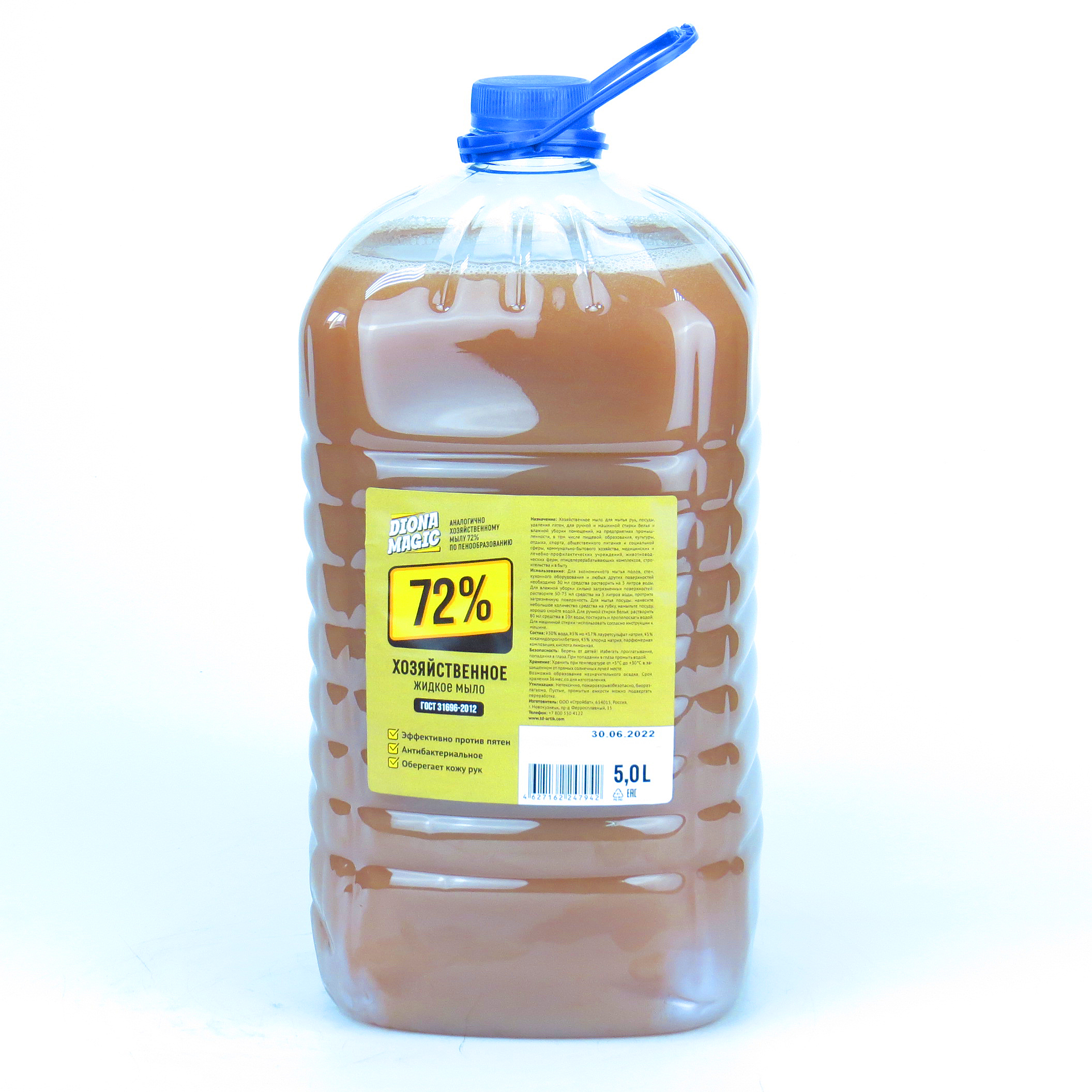 Хозяйственное мыло жидкое "Diona Magic" (Диона Мэджик) предназначено для мытья рук, посуды, удаления пятен, для ручной и машинной стирки белья и влажной уборки помещений, на предприятиях промышленности, в том числе пищевой, образования, культуры, отдыха, спорта, общественного питания и социальной сферы, коммунально-бытового хозяйства, медицинских и лечебно-профилактических учреждений, животноводческих ферм, птицеперерабатывающих комплексов, строительства и в быту.