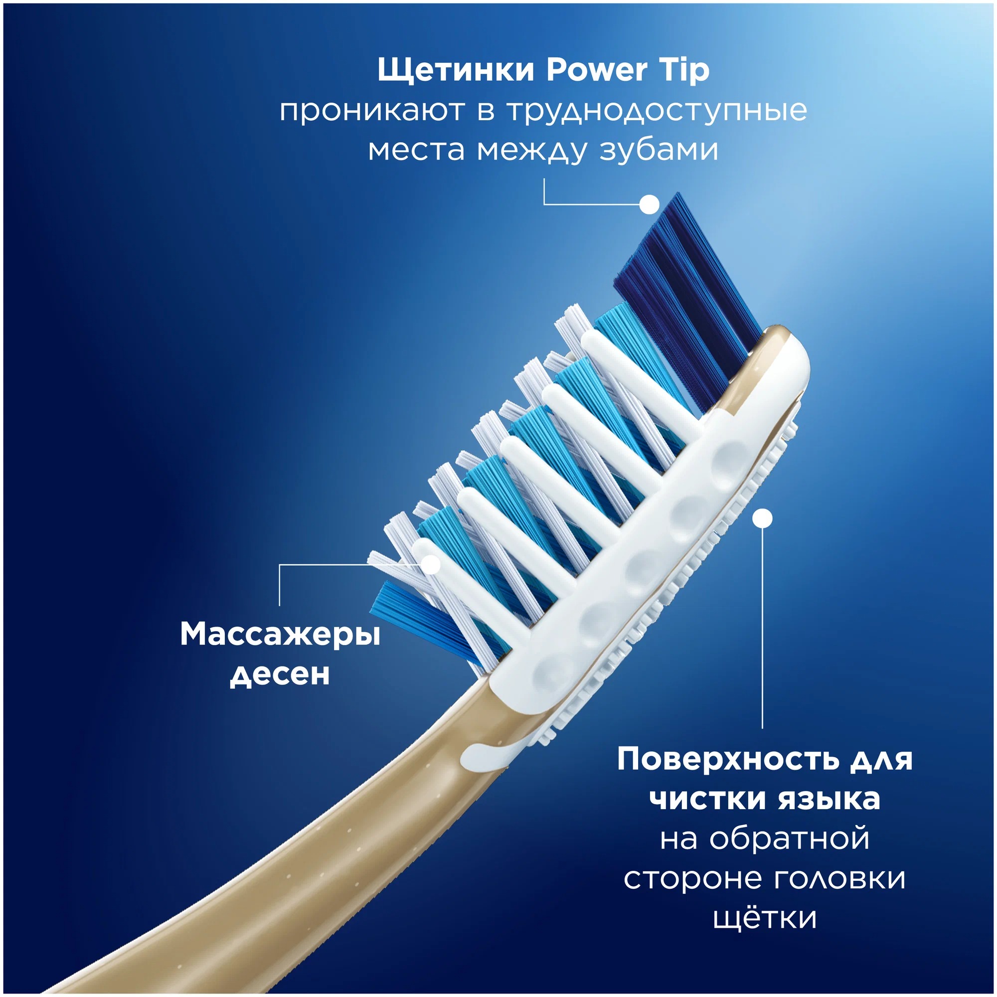 Щетинки Power Tip глубоко проникают в пространства между зубами, удаляя налет в труднодоступных местах.